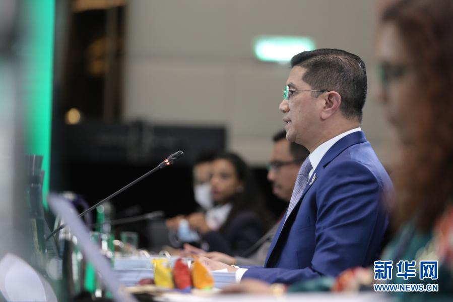 11月16日,在马来西亚吉隆坡,马来西亚国际贸易和工业部部长阿兹明·阿里在亚太经济合作组织部长会议上讲话。新华社发(亚太经合组织供图)