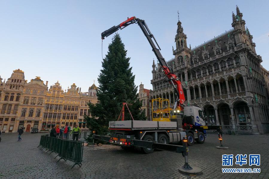 这是11月19日在比利时布鲁塞尔大广场拍摄的圣诞树安装现场。