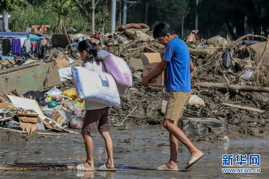 11月19日,在菲律宾马里基纳,人们在台风过后搬运生活用品。