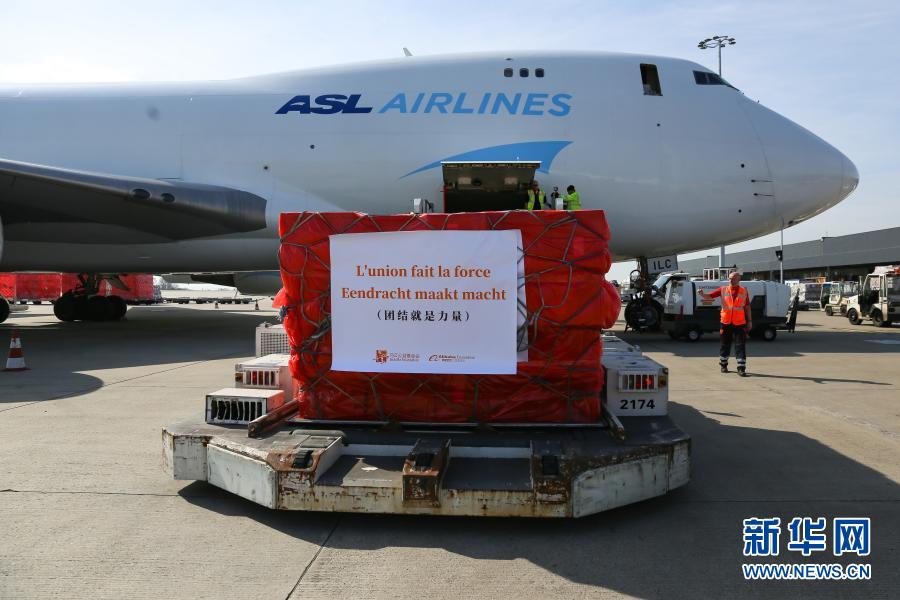 2020年3月16日,在比利时列日机场,工作人员运送口罩包裹。来自中国的30万只口罩当日运抵比利时列日机场。新华社记者 张铖 摄
