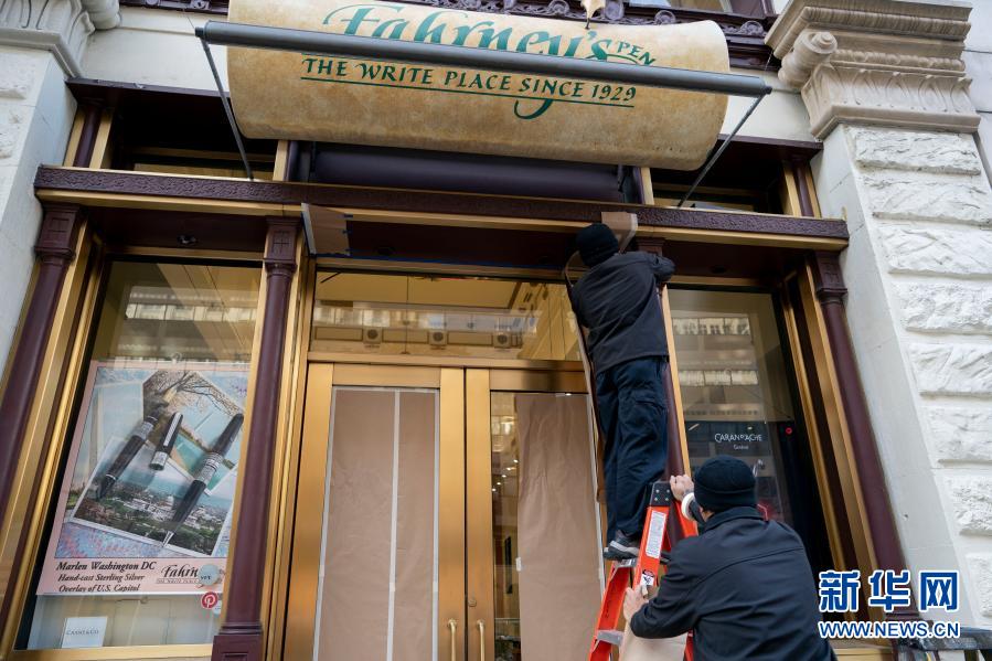 11月19日,在美国华盛顿,工作人员在装修一家文具店的门脸。新华社记者 刘杰 摄