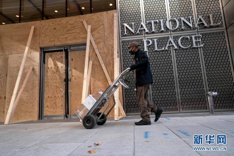 11月19日,美国华盛顿的一名快递员经过一处用木板加固门窗的办公楼。新华社记者 刘杰 摄