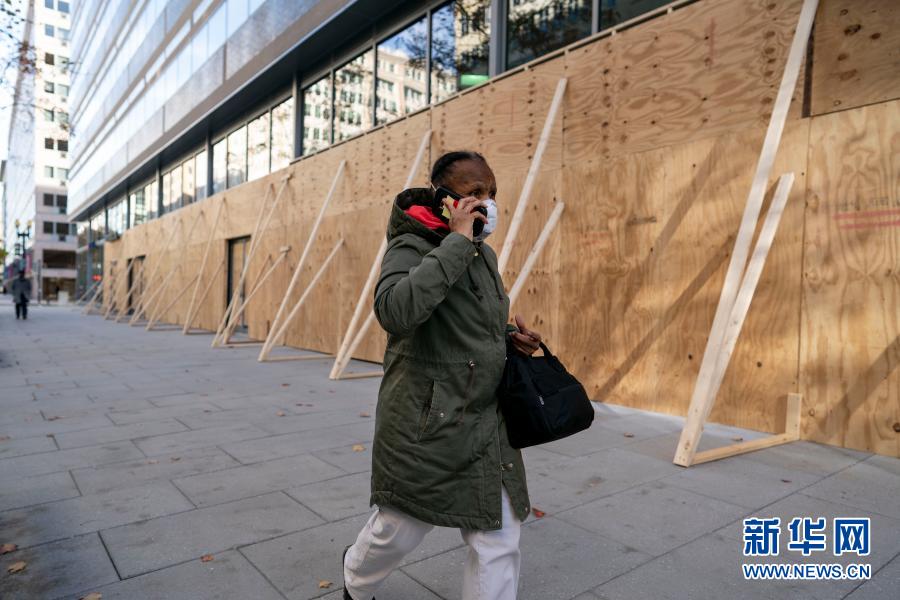 11月19日,在美国华盛顿,一名打电话的行人经过用木板加固门窗的办公楼。新华社记者 刘杰 摄