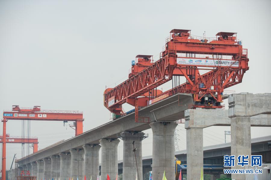 这是2020年9月2日在印度尼西亚雅万高铁1号梁场拍摄的架梁机正在工作。