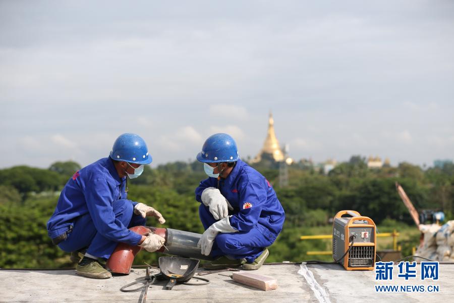 10月28日,在缅甸仰光的国家剧院维修改造项目现场,觉泰昂在师父的指导下焊接钢管。新华社发(吴昂摄)