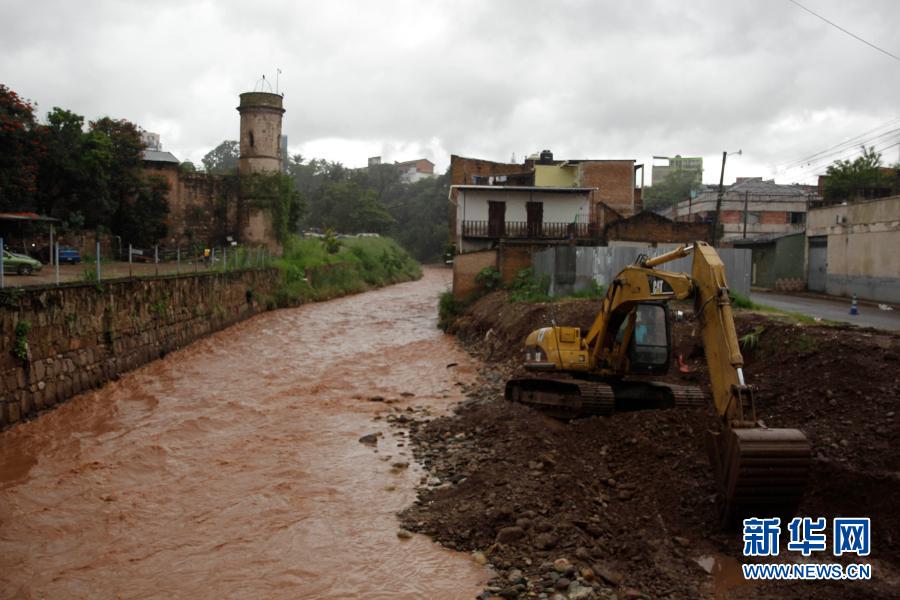11月19日,在洪都拉斯特古西加尔巴,一辆挖掘机在清理河道。
