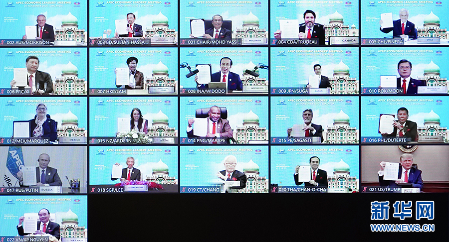 11月20日晚,国家主席习近平在北京以视频方式出席亚太经合组织第二十七次领导人非正式会议并发表重要讲话。这是与会各经济体领导人、代表通过《2040年亚太经合组织布特拉加亚愿景》并线上合影。 新华社记者 李响 摄