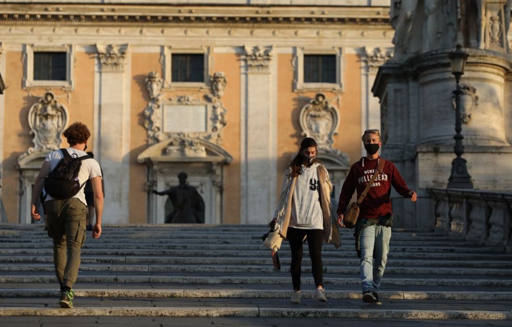 11月10日,在意大利首都罗马,人们戴着口罩走在罗马市政厅前。新华社记者程婷婷摄