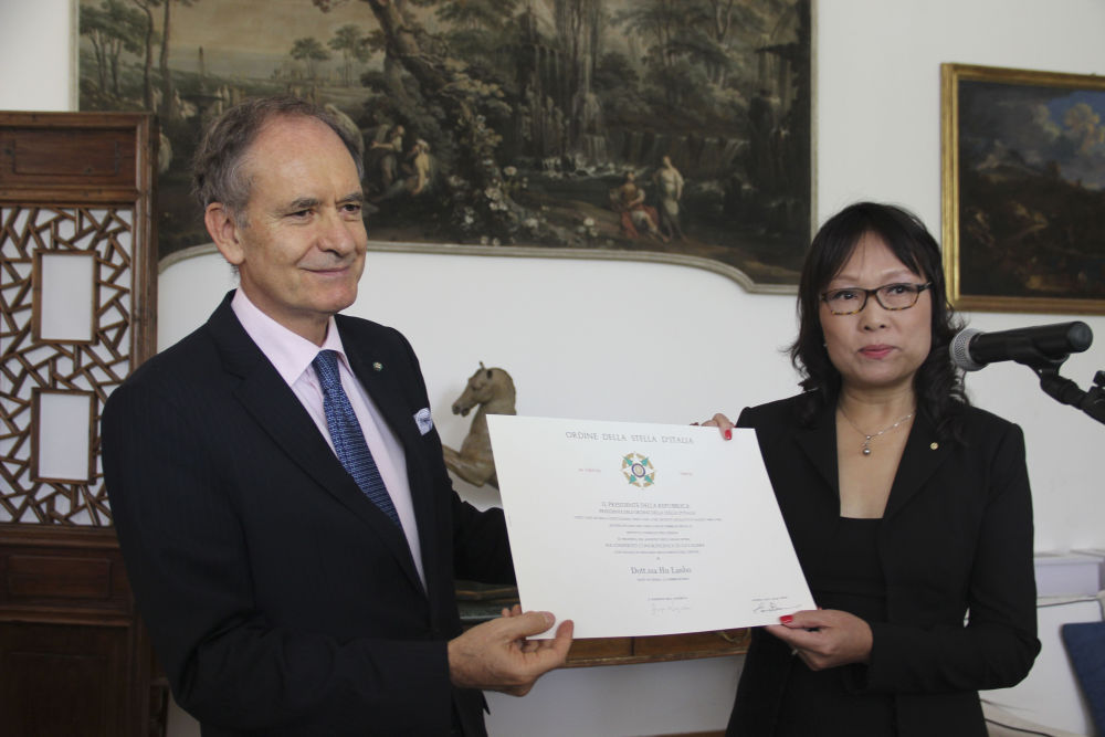 2014年9月30日,时任意大利驻华大使白达宁(左)在其位于北京的官邸向胡兰波颁发意大利之星骑士勋章和证书,以表彰她为中意两国间文化交流所作出的杰出贡献。(由受访者提供,王虹摄)