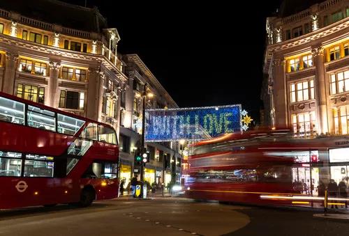 11月3日,车辆行人在英国伦敦牛津街点亮的节日彩灯下穿行。英国伦敦牛津街2日点亮一年一度的圣诞节日彩灯,今年的主题是号召人们团结抗疫,并向抗疫英雄致敬。新华社记者 韩岩 摄