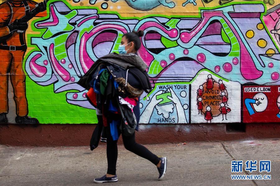 11月21日,在美国纽约,一名女子走过抗疫宣传壁画。