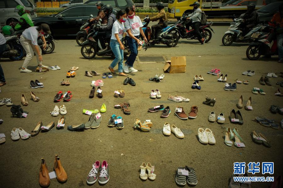 这是11月25日在印度尼西亚雅加达拍摄的摆放在国会大厦前的象征反对性暴力的鞋子。