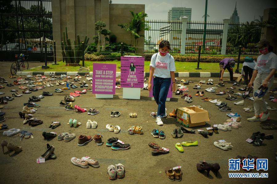 近日,人们在印度尼西亚雅加达的国会大厦前举行反对性暴力的活动。