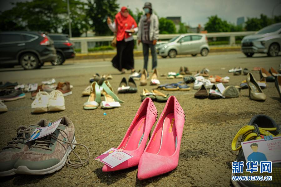 这是11月25日在印度尼西亚雅加达拍摄的摆放在国会大厦前的象征反对性暴力的鞋子。