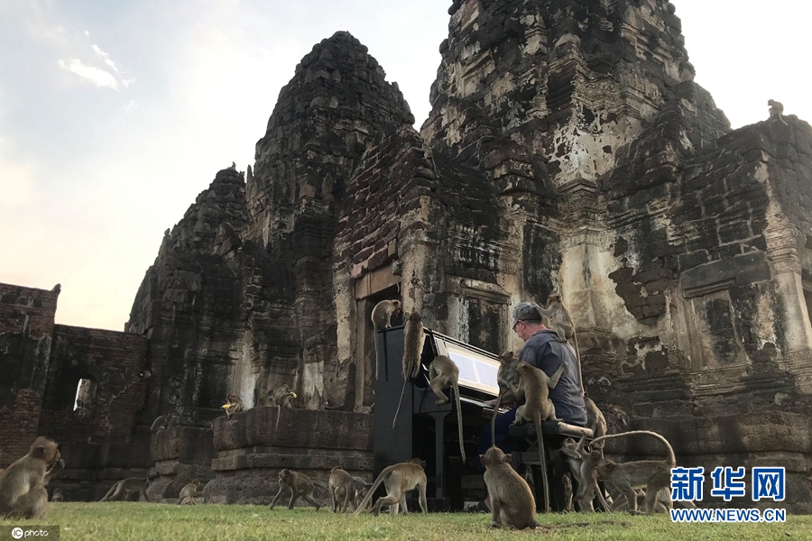 11月21日,泰国华富里府,英国钢琴家保罗·巴顿(Paul Barton)为一群猴子弹钢琴。演奏过程中,多只猴子在他周围跑来跑去,有几只还爬上了钢琴,甚至在他的头顶跳来跳去。巴顿称,这场特殊的音乐会旨在引起人们对这群饥饿的猴子的重视。(图片来源:东方IC)