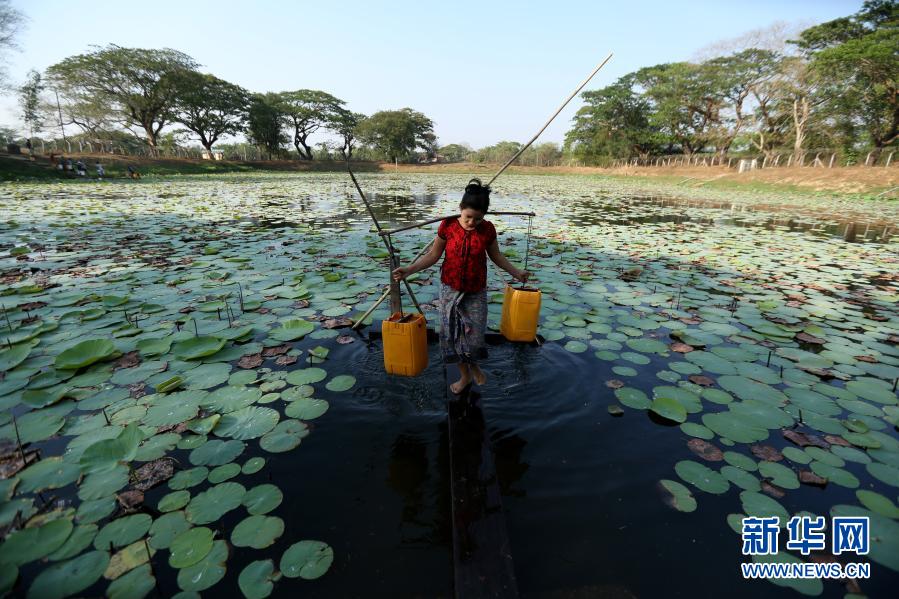 3月22日,在缅甸仰光郊区,一名妇女在挑水。