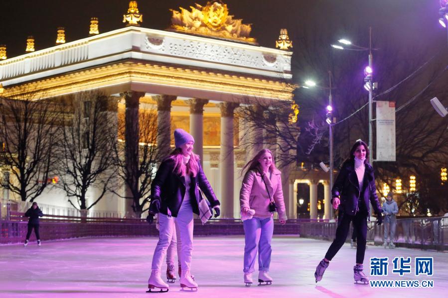 11月27日,人们在俄罗斯首都莫斯科国民经济成就展览馆的冰场滑冰。