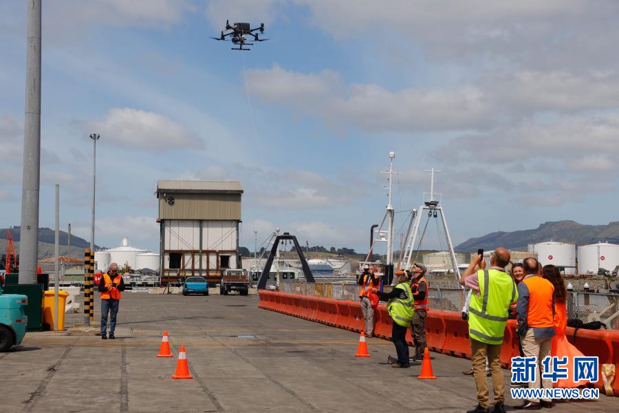 11月28日,在新西兰南岛克赖斯特彻奇市利特尔顿港,新方将赠送给中国南极科考队的礼物用无人机投递到“雪龙2”号甲板上。新华社发(孙晓桐 摄)