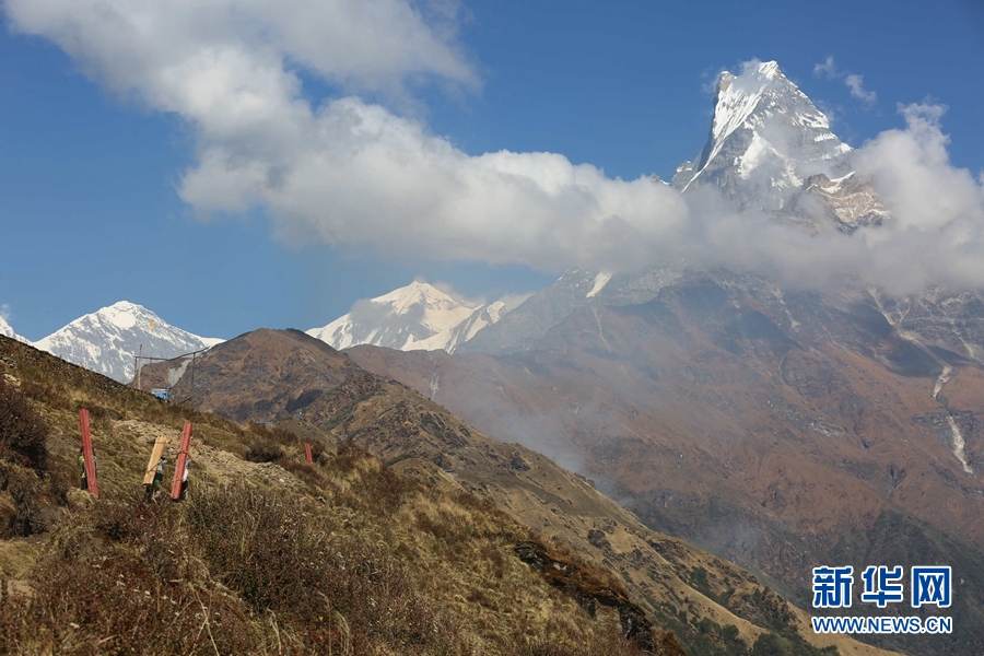 在徒步路上,挑夫们在运送建筑材料,远处巍峨的雪山高耸入云。(记者 唐薇 摄)