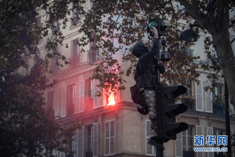 11月28日,一名男子在法国巴黎的游行示威中爬上杆子,向摄像头喷漆。