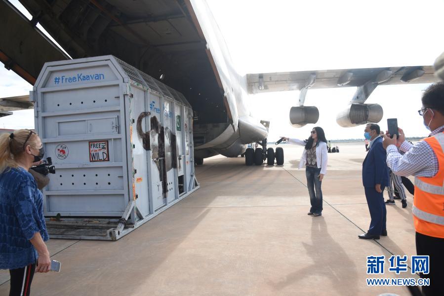 11月30日,装有大象“卡万”的集装箱被运抵柬埔寨暹粒国际机场。