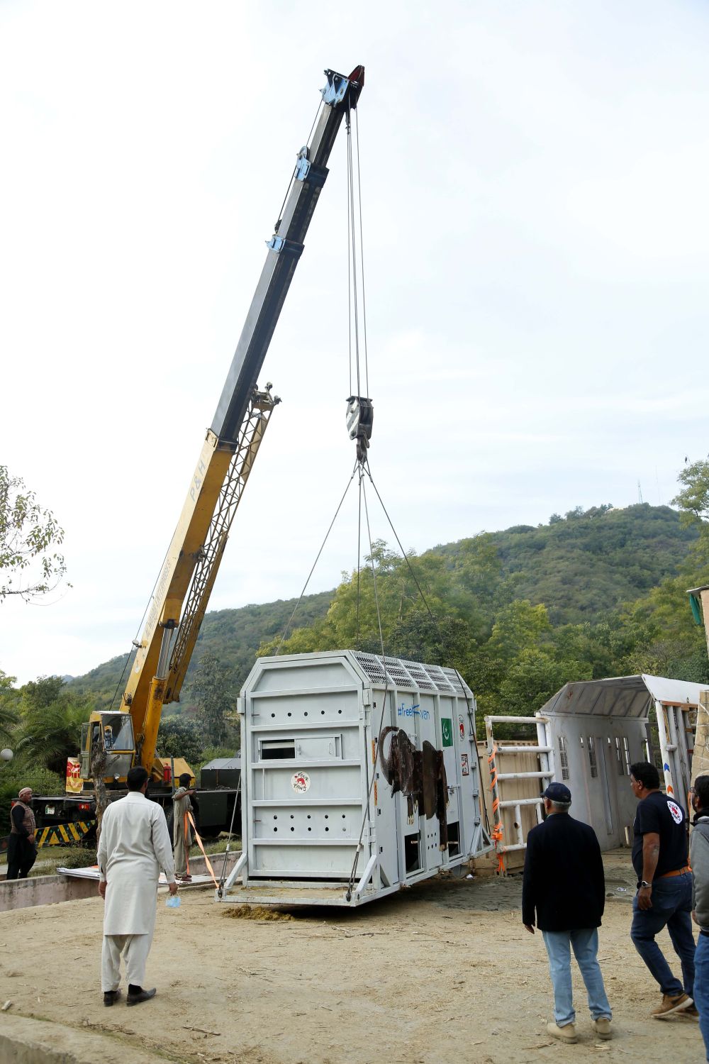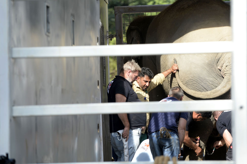 ↑11月29日,在巴基斯坦伊斯兰堡,工作人员为运输大象做准备