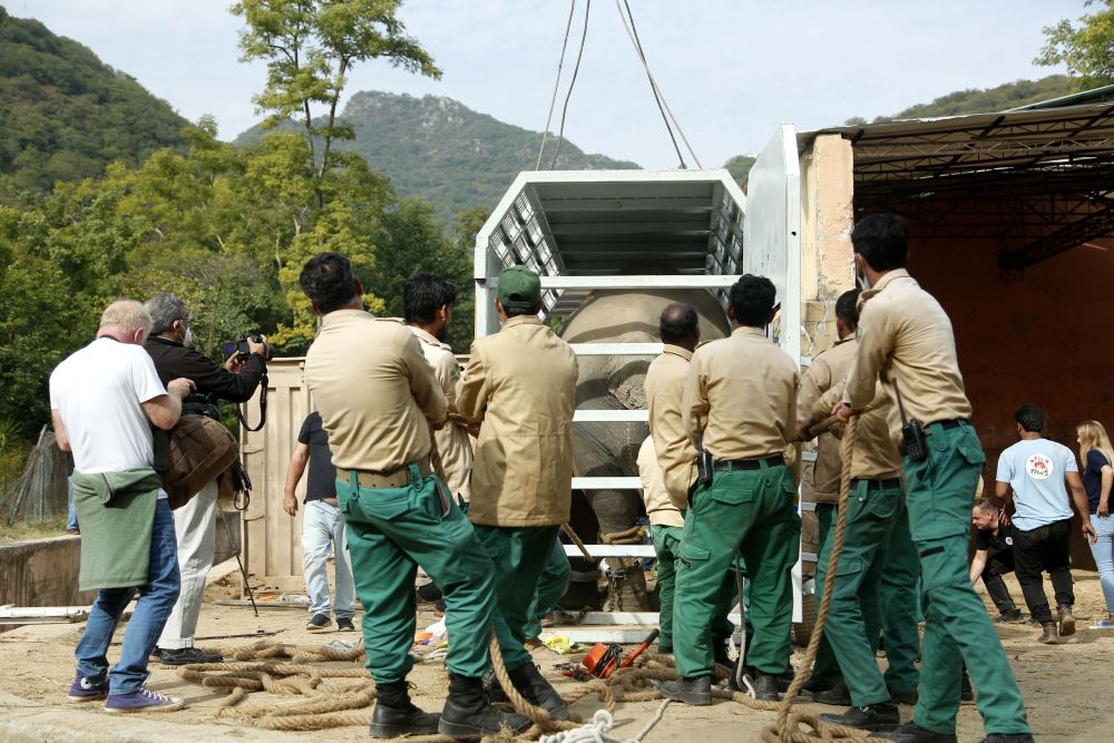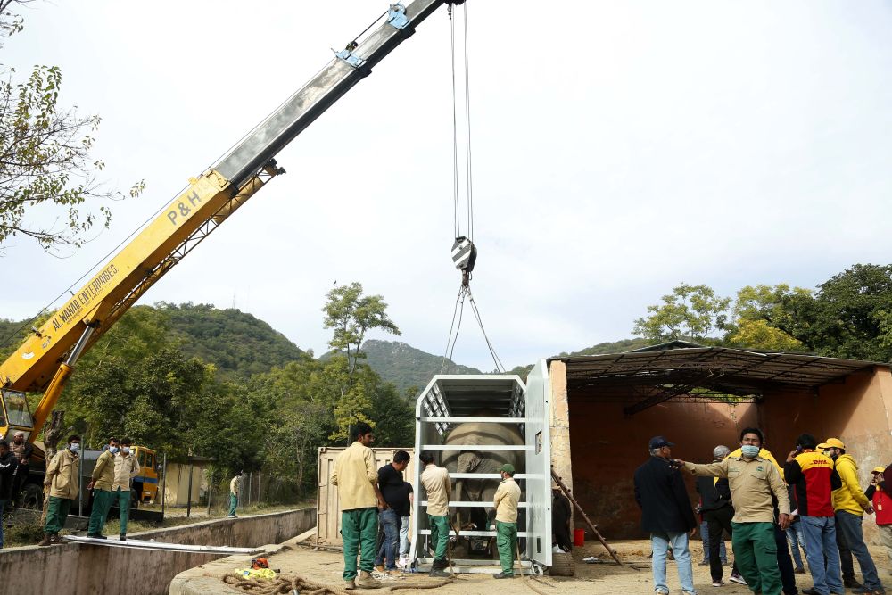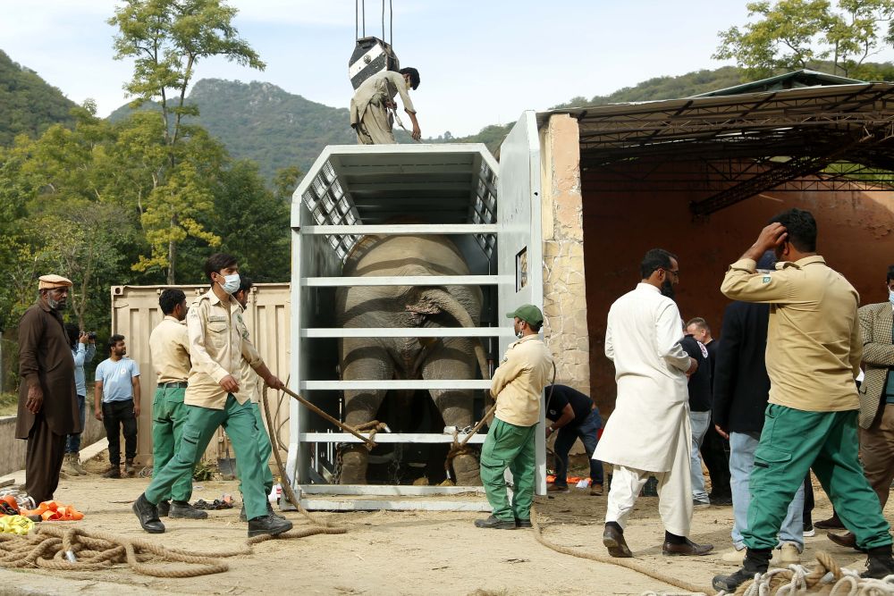 ↑11月29日,在巴基斯坦伊斯兰堡,工作人员搬运装有大象的运输箱
