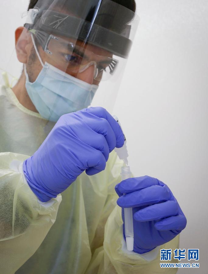 11月30日,在加拿大里士满的温哥华国际机场,一名工作人员在新冠病毒快速检测中心准备检测材料。