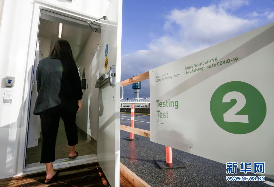 11月30日,在加拿大里士满的温哥华国际机场,一名女子进入新冠病毒快速检测中心接受检测。
