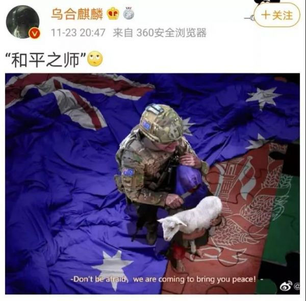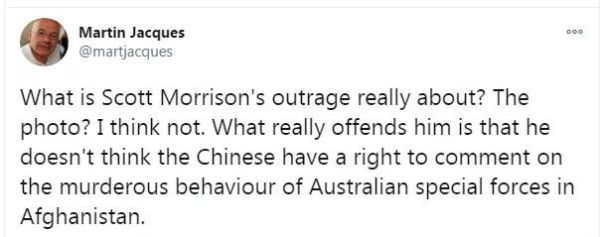 “莫里森的愤怒到底是什么?‘照片’?我想不是。真正令他恼怒的是,他认为中国人无权对澳大利亚特种部队在阿富汗的谋杀行为发表评论。”