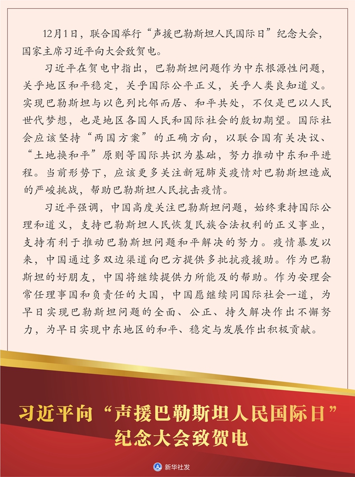 新华社北京12月2日电 12月1日,联合国举行“声援巴勒斯坦人民国际日”纪念大会,国家主席习近平向大会致贺电。