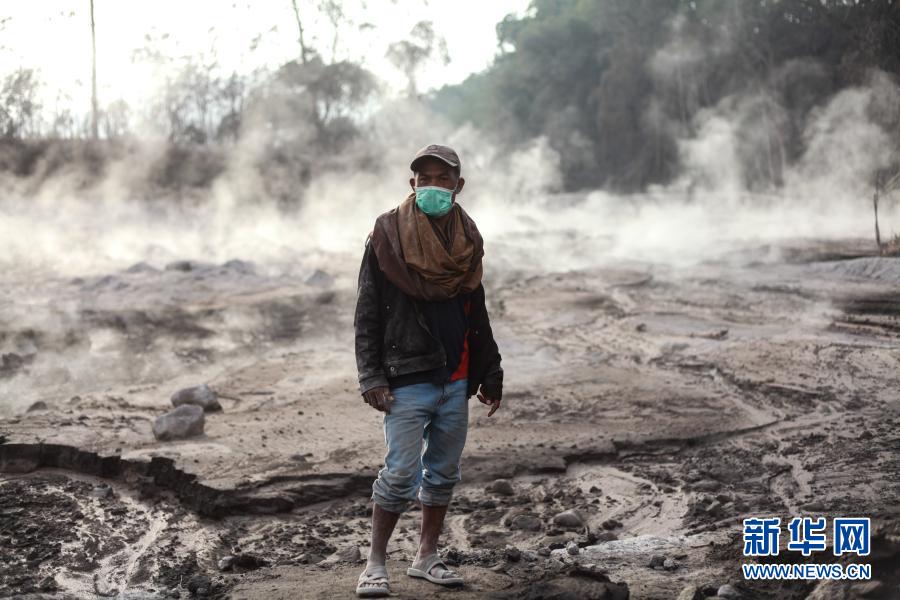 12月2日,在印度尼西亚东爪哇省卢马姜地区,一名面戴口罩的当地居民站在仍有余温的火山灰上。