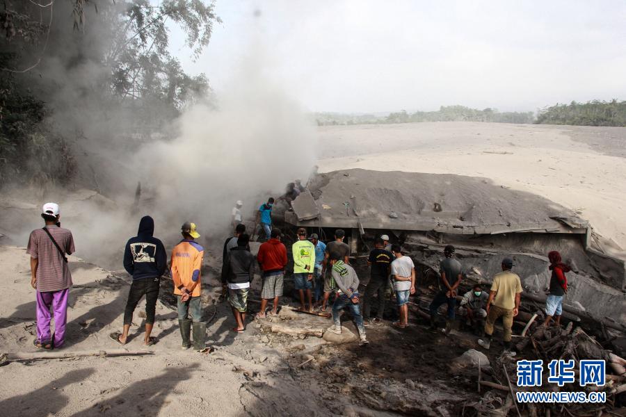 12月2日,在印度尼西亚东爪哇省卢马姜地区,当地居民站在一座被火山灰掩埋的房屋前。