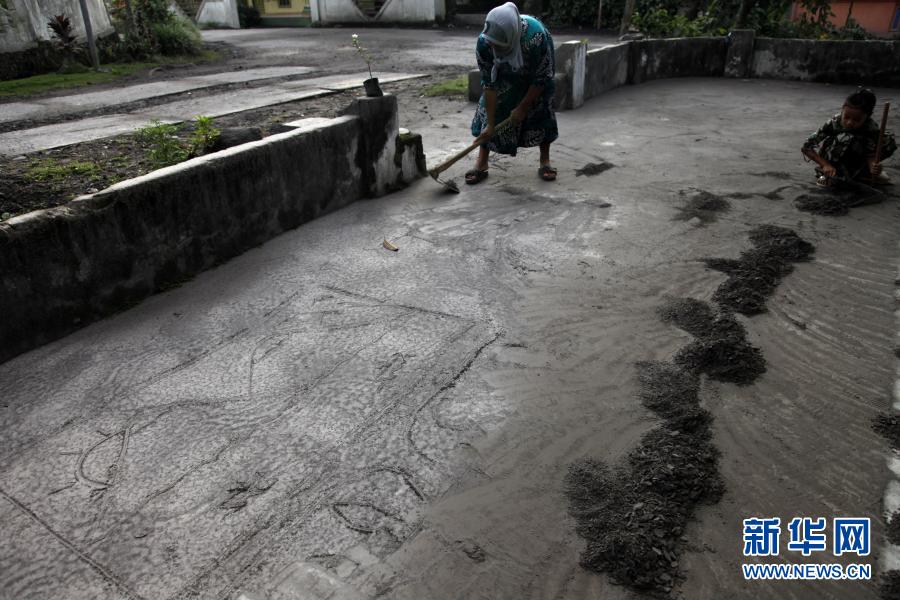 12月2日,在印度尼西亚东爪哇省卢马姜地区,一名当地居民清理自家院子里的火山灰。