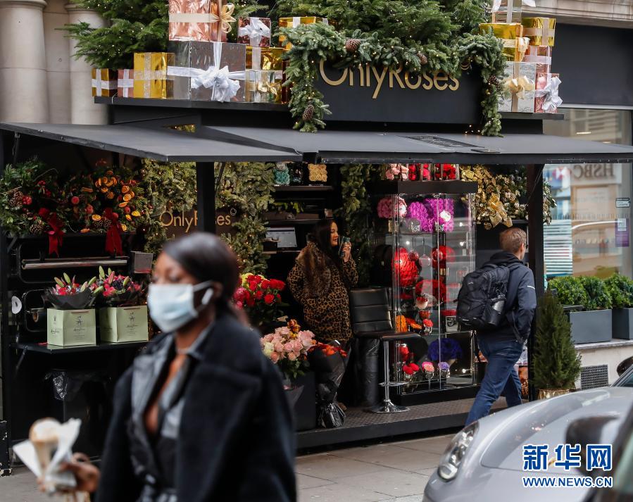 12月2日,行人从英国伦敦一家重新开门的花店旁走过。