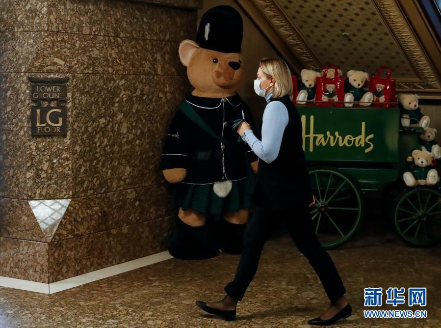 12月2日,一名戴口罩的女子走在英国伦敦重新开门营业的哈罗德百货商场内。