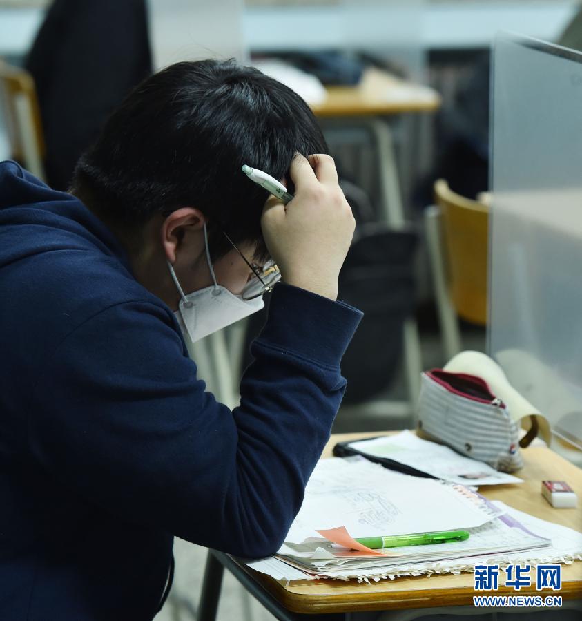 12月3日,在韩国京畿道城南市,一名考生准备参加考试。新华社发(李相浩 摄)