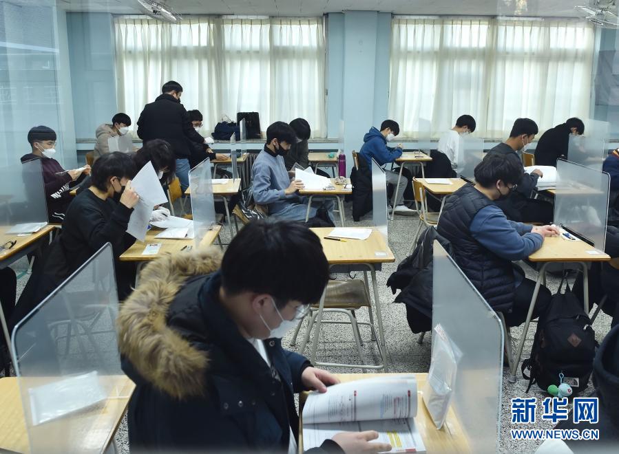 12月3日,在韩国京畿道城南市,考生们准备参加考试。新华社发(李相浩 摄)