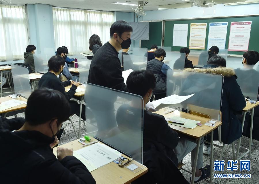 12月3日,在韩国京畿道城南市,监考人员在某考点向考生分发试卷。新华社发(李相浩 摄)