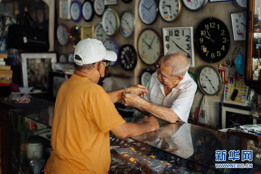 12月5日,在马来西亚雪兰莪州巴生的郁昌表行,韦华为顾客佩戴修好的手表。新华社记者 朱炜 摄