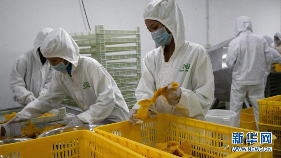 11月12日,在位于柬埔寨磅士卑省的朗禾果业有限公司工厂,工人加工芒果干。新华社发(张照摄)