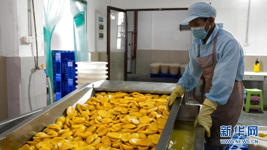 11月12日,在位于柬埔寨磅士卑省的闽柬工业产业园区,工人加工芒果干。新华社发(张照摄)