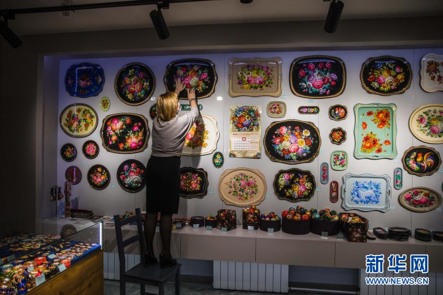 12月8日,在俄罗斯莫斯科州若斯托沃村,工作人员整理若斯托沃彩画工艺品。