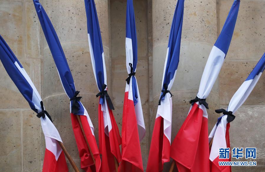 12月9日,法国巴黎国民议会外的国旗用黑丝带束起,悼念2日逝世的前总统德斯坦。