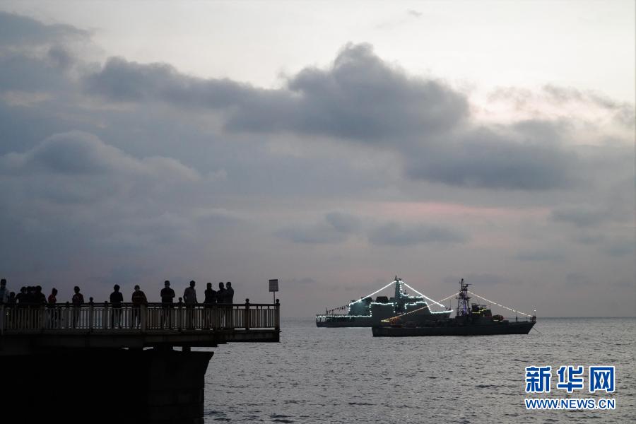 12月9日,在斯里兰卡科伦坡加勒菲斯绿地广场附近的一个码头,人们观看参加阅兵活动的船只。当日,斯里兰卡海军在科伦坡举行阅兵活动,庆祝海军建军70周年。新华社记者唐璐摄