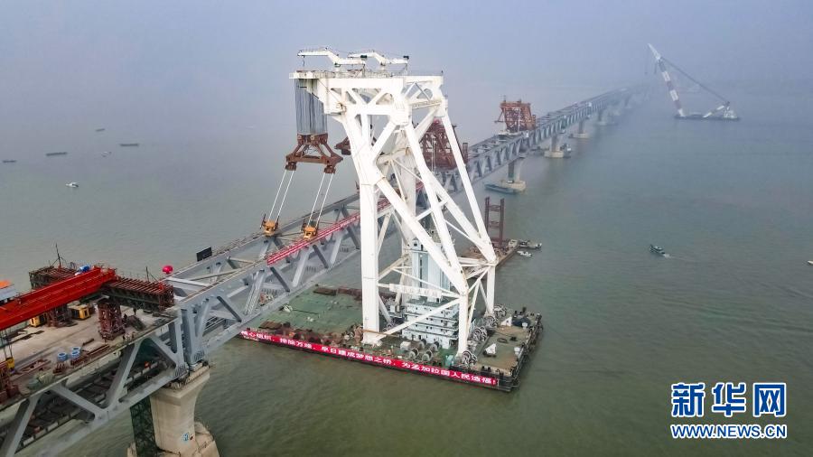 12月10日,在位于孟加拉国首都达卡西南约40公里处的帕德玛大桥项目现场,万吨级中心架梁起重船“天一号”将最后一跨钢梁架设到指定桥墩上。
