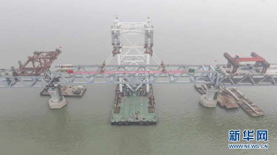 12月10日,在位于孟加拉国首都达卡西南约40公里处的帕德玛大桥项目现场,万吨级中心架梁起重船“天一号”将最后一跨钢梁架设到指定桥墩上。