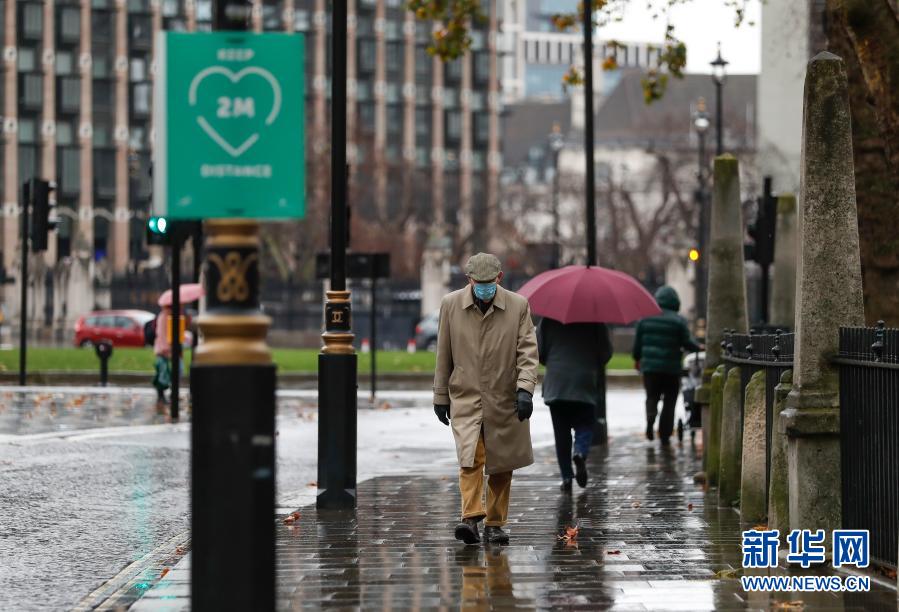 12月13日,一名戴着口罩的老人在雨中的英国伦敦街头行走。 新华社记者韩岩摄