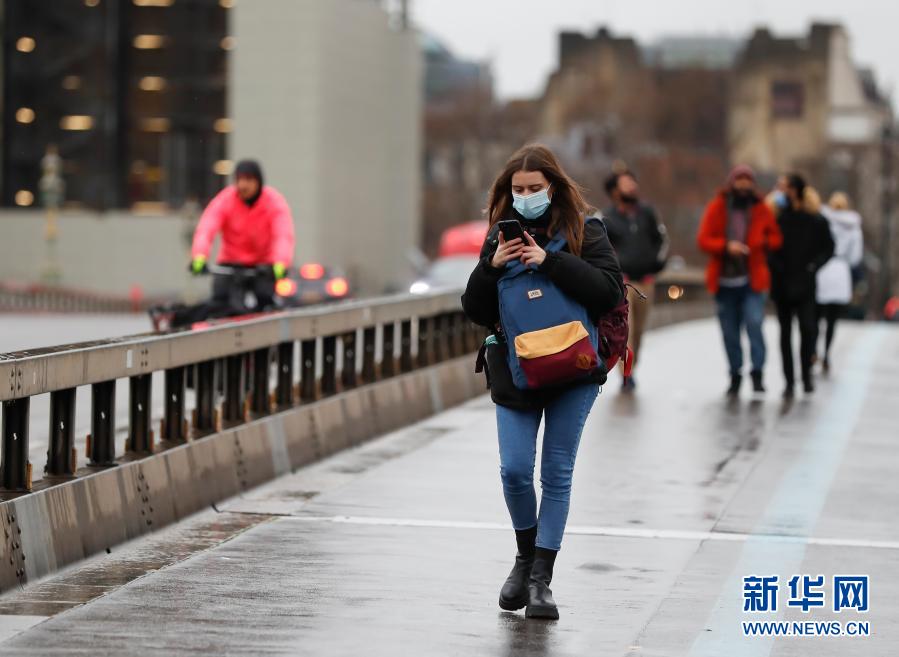 12月13日,一名戴着口罩的女子在英国伦敦的威斯敏斯特桥上行走。 新华社记者韩岩摄