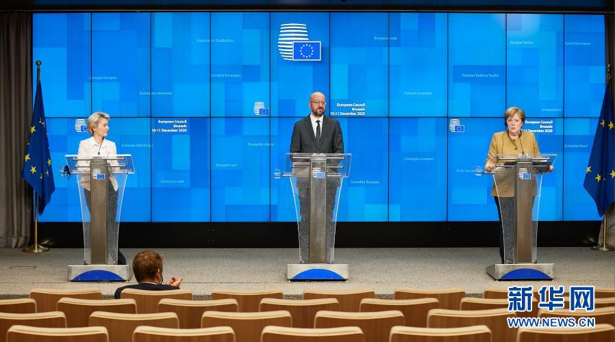 12月11日,在比利时布鲁塞尔的欧盟总部,欧盟委员会主席冯德莱恩、欧洲理事会主席米歇尔和德国总理默克尔(从左至右)在欧盟冬季峰会结束后出席线上联合记者会。